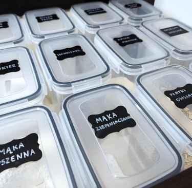 💡 Tip: Clear bins help you SEE what you have so you don’t overbuy groceries.